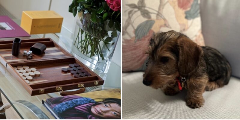 HA: ”The best form of relaxation for me has to be playing tennis or padel; I represent two London clubs for tennis and captain one of the teams, and I picked up padel last year, which I’m loving. Otherwise, it’s having a long soak in a bath or cuddles with our puppy, ‘Tarka’ (above, right), who’s a miniature wire haired daschund…”